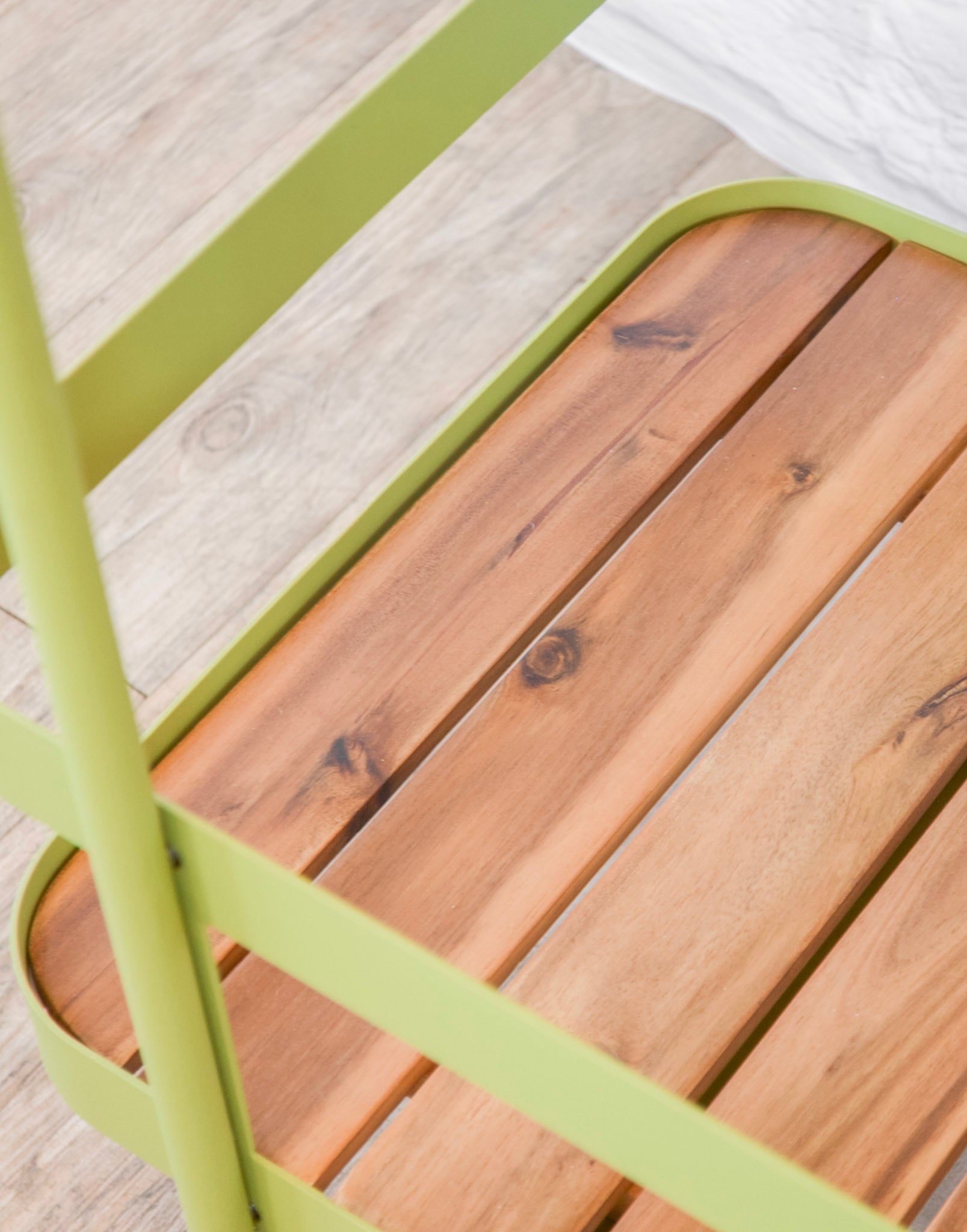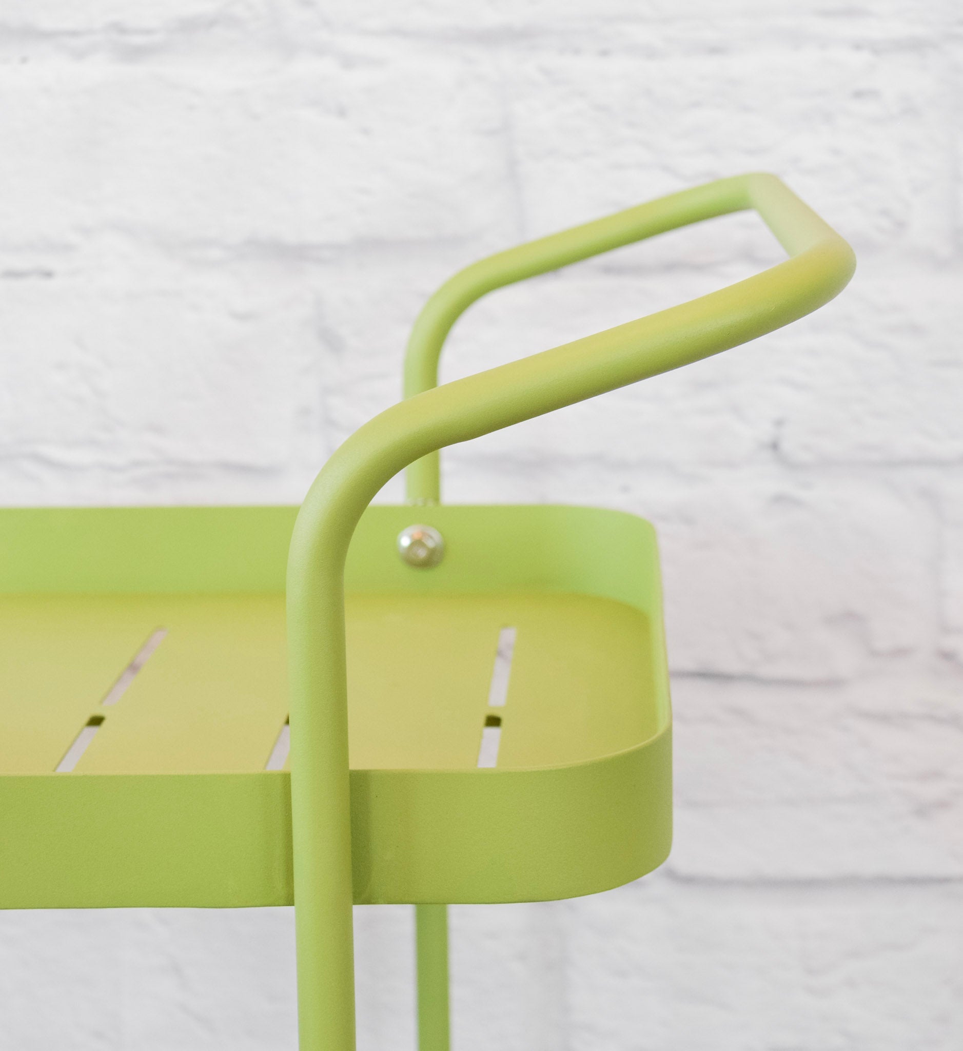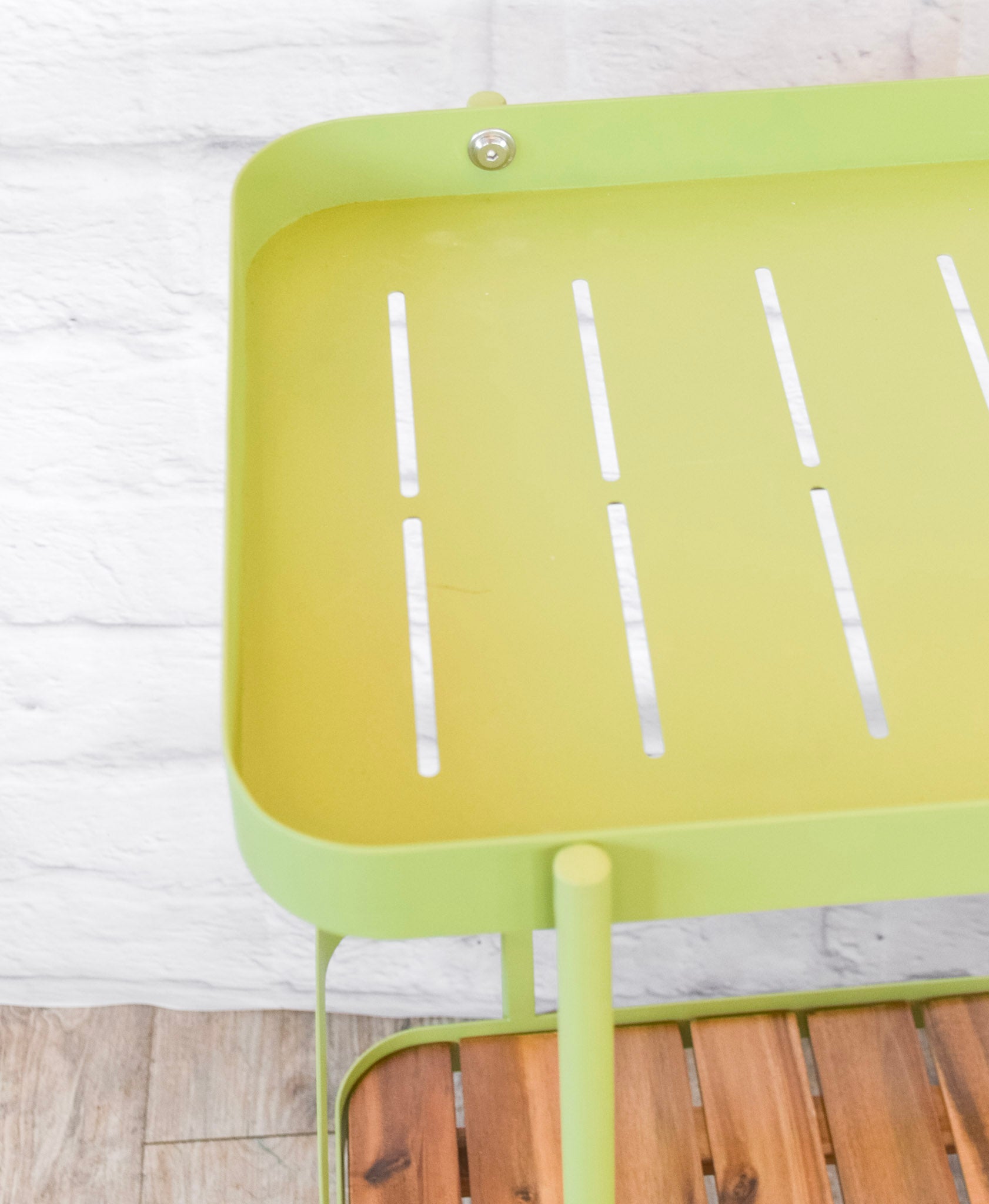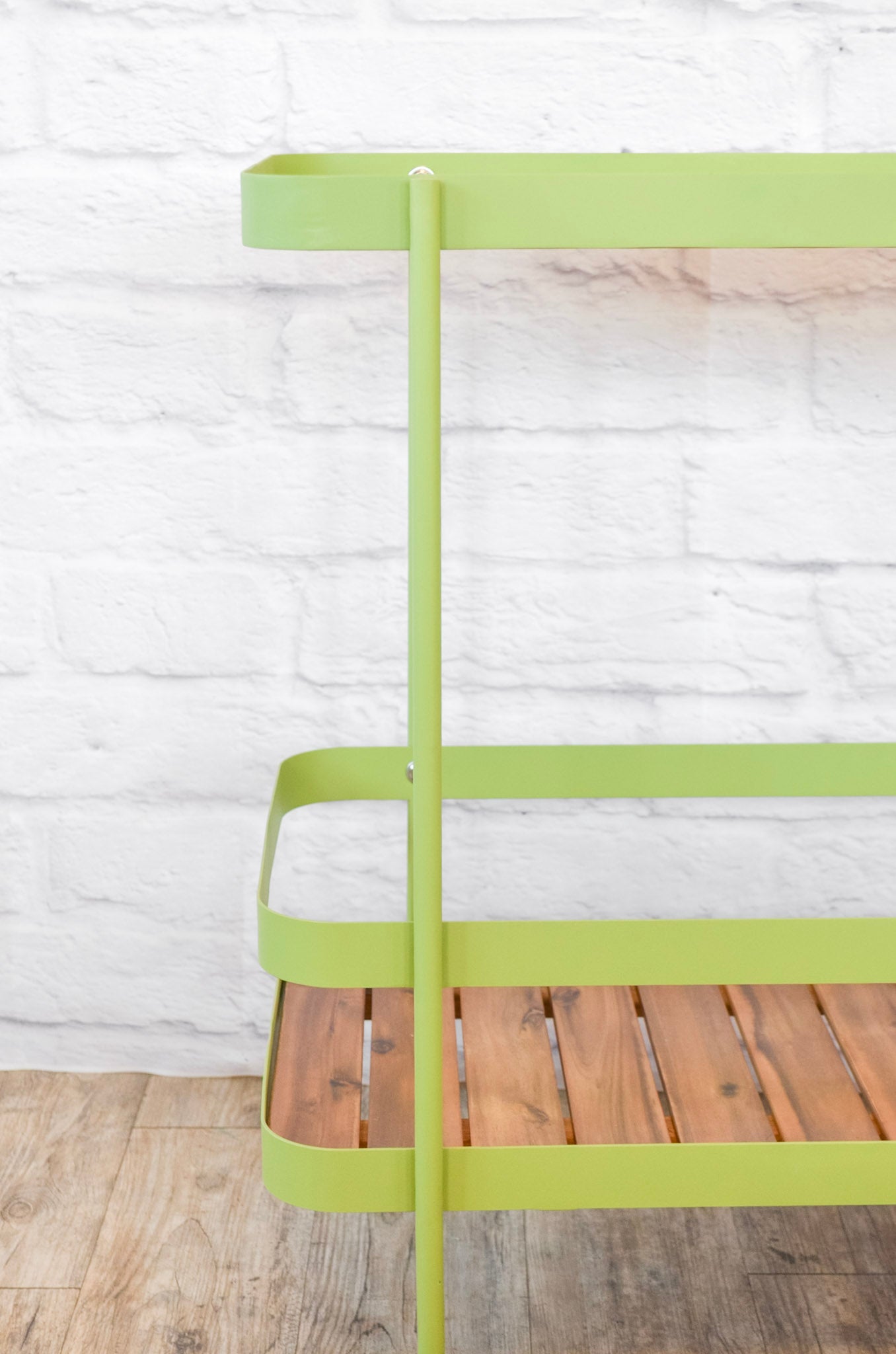 With its fun and whimsical design, this garden or bar cart is perfect for both indoor and outdoor use. Made of sturdy green metal and featuring a natural finish acacia wood bottom, it is both practical and stylish. Plus, with 2 casters, it is easy to move around for all your entertaining needs!