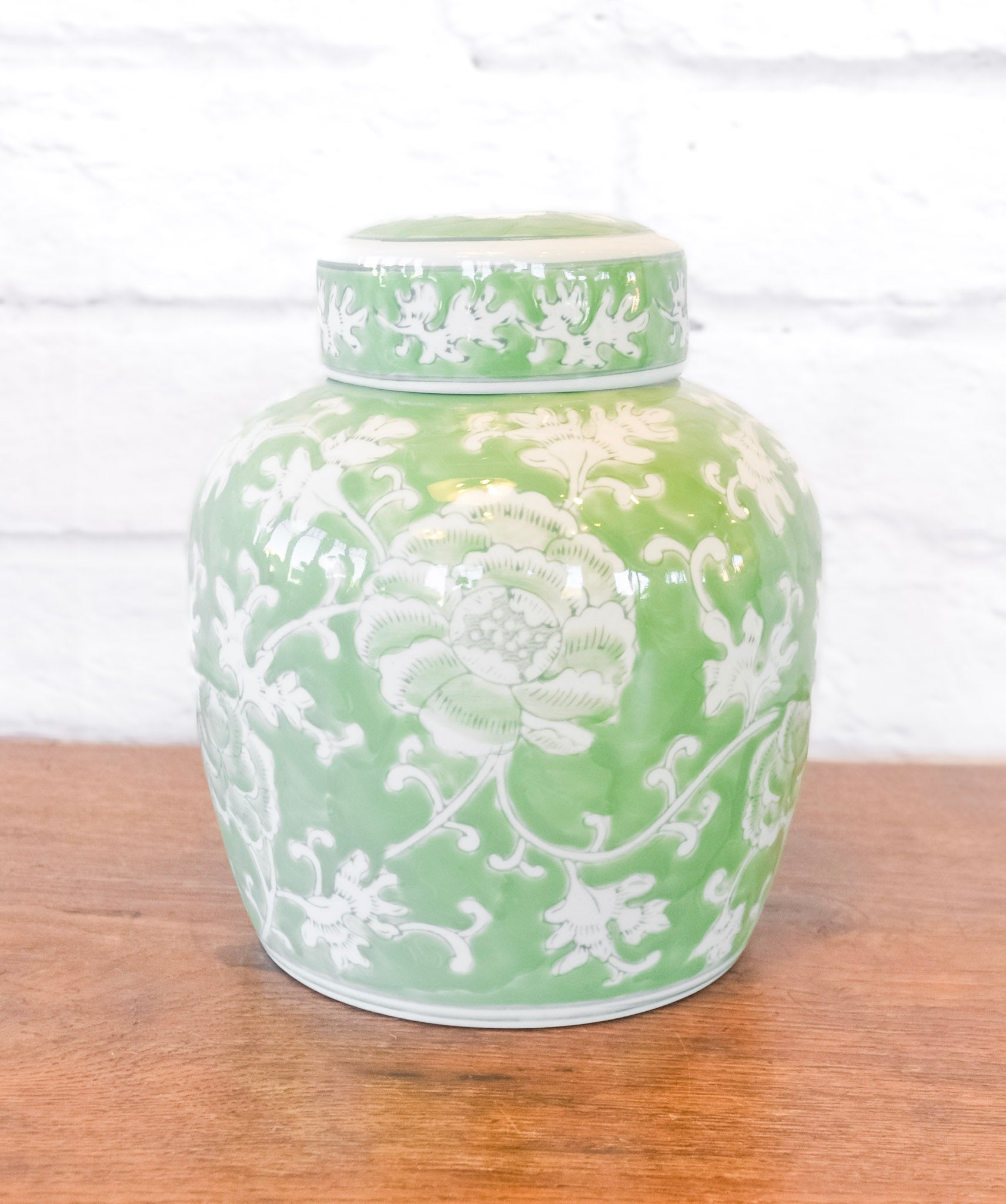 Bring a touch of elegance to your space with this charming lidded jar! Featuring an exquisite oriental pattern, delicate white botanical motifs dance across a serene green background in true chinoiserie style. Perfect for storing treasures or simply displaying as a decorative accent, this piece captures timeless beauty with a whimsical spirit. A classic addition that transforms any room into a sophisticated sanctuary!