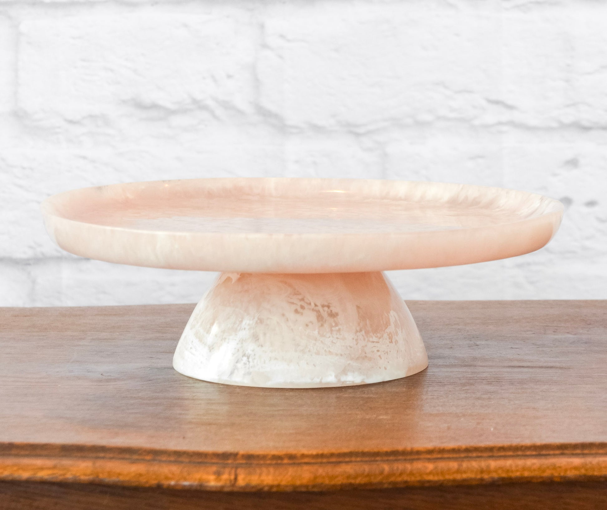 This blush resin dessert stand adds height and dimension to your table! Made of high-quality, durable resin with a matte marbled effect and a sturdy base, it's perfect for displaying cakes, pies, cookies, and more. Its unique design adds a touch of fun and freshness to any space!