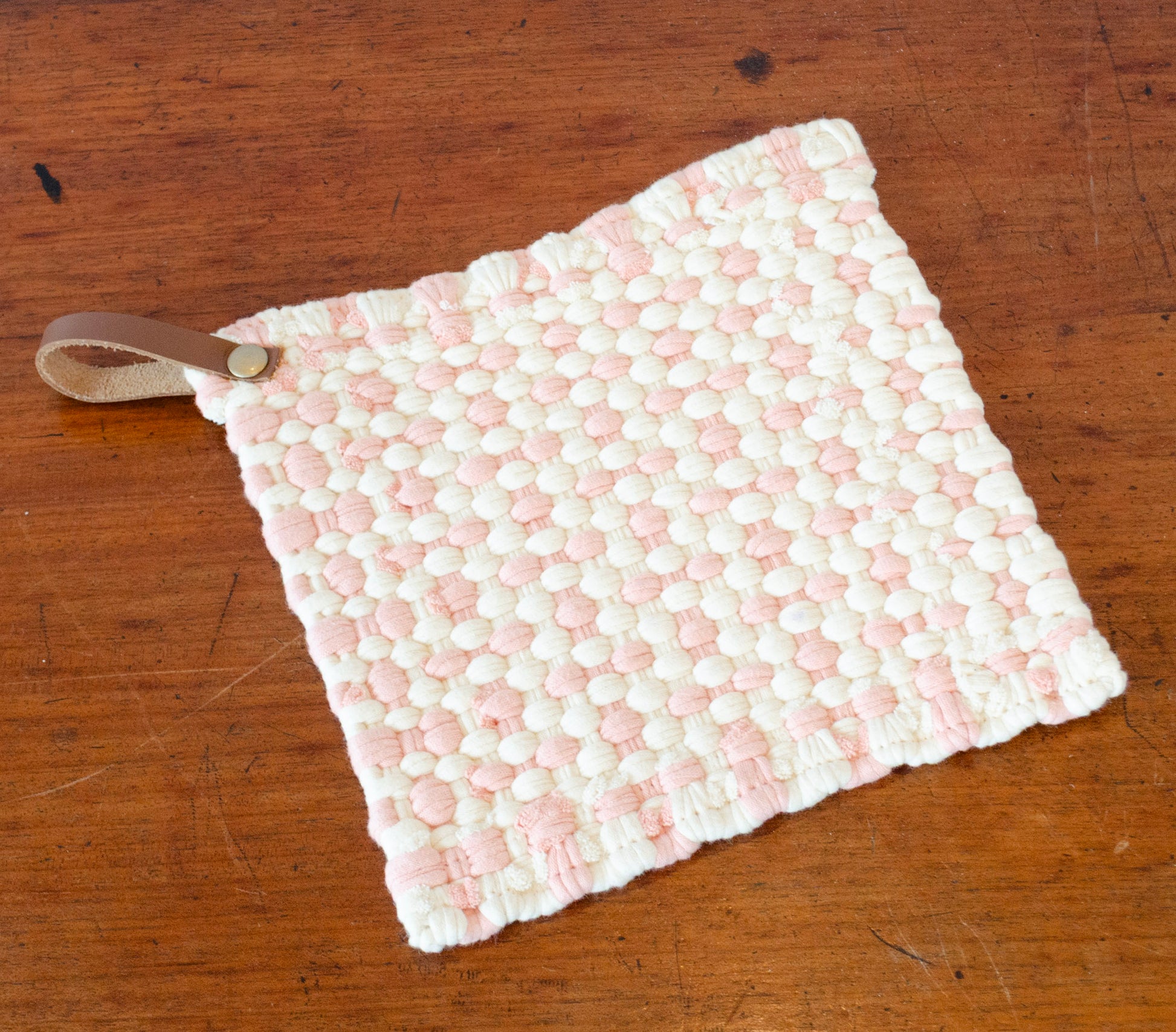 Checkered Crocheted Pot Holder w/ Leather Tie