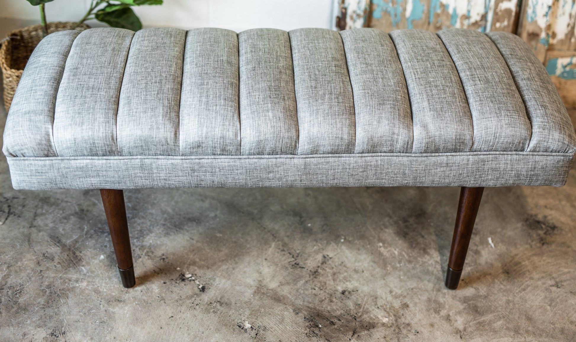 Looking for a sleek and modern bench to complete your home decor? Look no further than the Elise Bench! With its gorgeous grey linen-like fabric upholstery, unique channeled detailing, and sleek tapered legs with brass detail, this bench is sure to catch the eye of any guest. Perfect for adding extra seating to your living space or as a stylish accent to your bedroom, the Elise Bench is a must-have for any design-savvy homeowner.