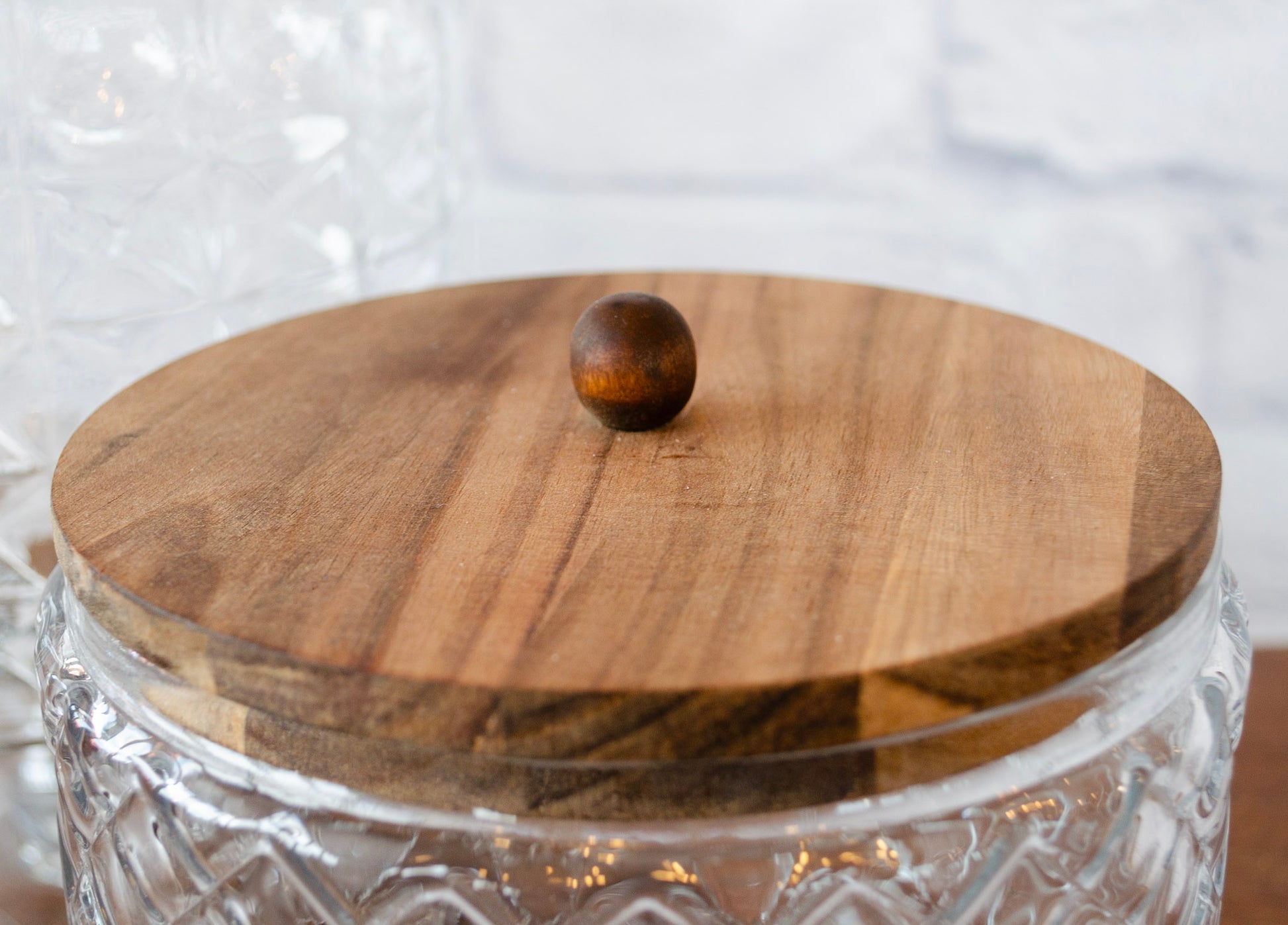 Store and serve in style with our Cut Glass Canister Collection! These classic canisters are made with gorgeous cut glass and topped with acacia wood lids. Add to your collection with a matching jar and drink dispenser! Timeless and beautiful, this collection will effortlessly elevate your kitchen decor.