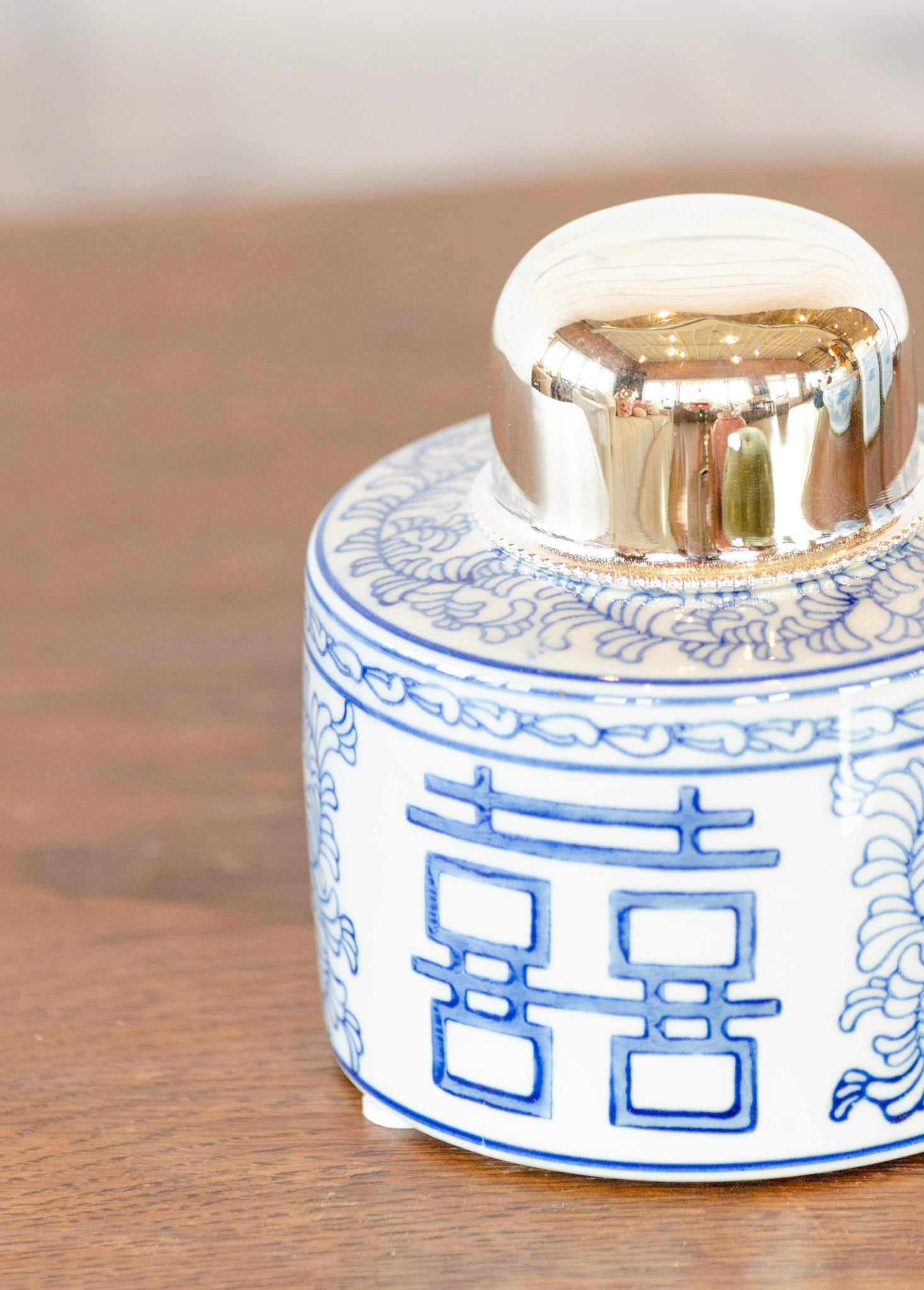 These blue and white tea jars are hand painted with traditional Chinese patterns. Each jar comes with a silver plated brass top.