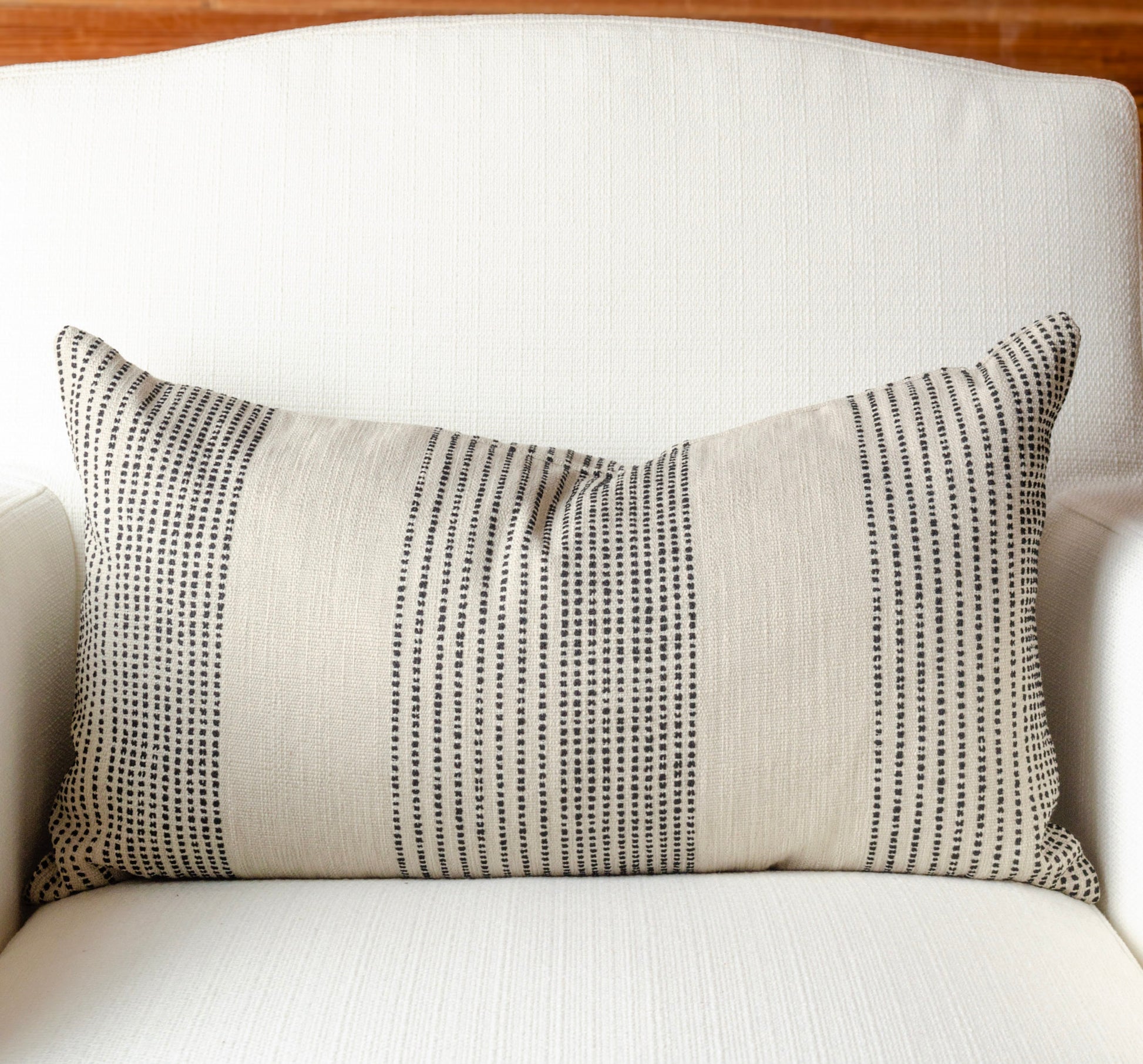 Bring a touch of edgy style to your living space with the Endless Onyx Lumbar Pillow! Its unique dotted black stripes add a pop of personality to any couch, chair, or bed, while the neutral background allows for versatile decorating. Plus, with the included premium feather-down insert, it's as comfortable as it is stylish!