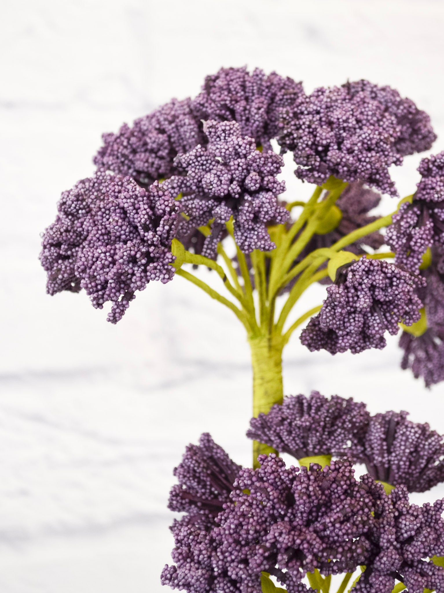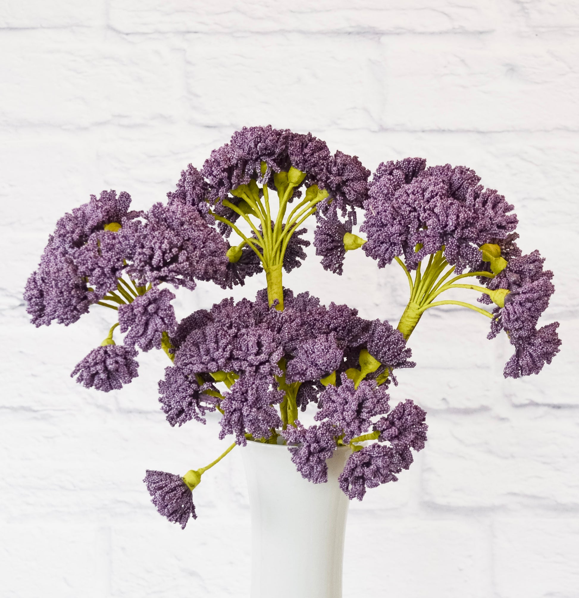 Add a touch of color and charm to your home with our Faux Lavender Bundle Stem. Each stem features two beautiful lavender-colored blossom bunches, perfect for creating unique and eye-catching arrangements. Whether used on its own or as part of a larger display, this stem adds dimension and interest to any space. No green thumb required!