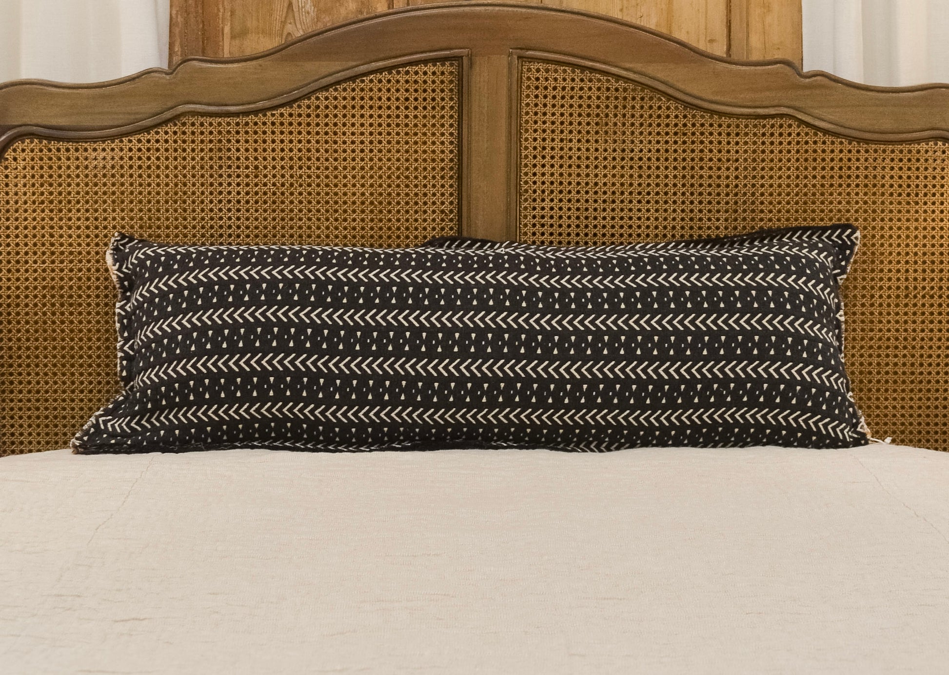 Getz pillow's reversible coverlet features traditional African mud cloth patterns, transforming from black to rustic bronze! And, to make it even better, it includes a down alternative fill!