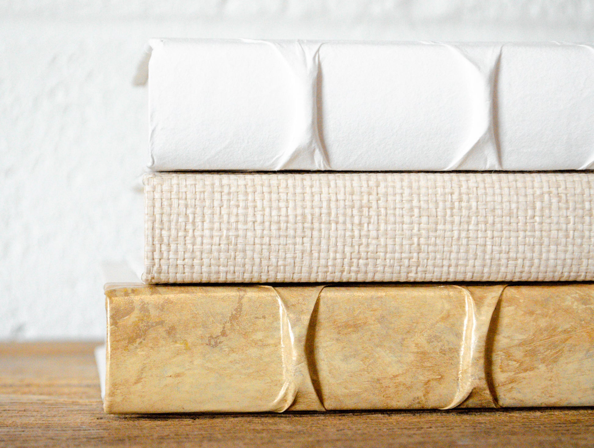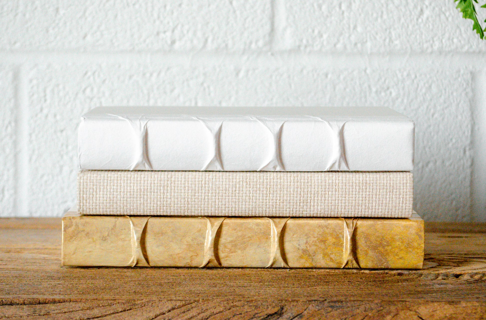 Elevate your bookshelf game with this set of 3 books, featuring a gold, white and grasscloth book. The raised bands and unique texture add a timeless yet modern feel to any space!