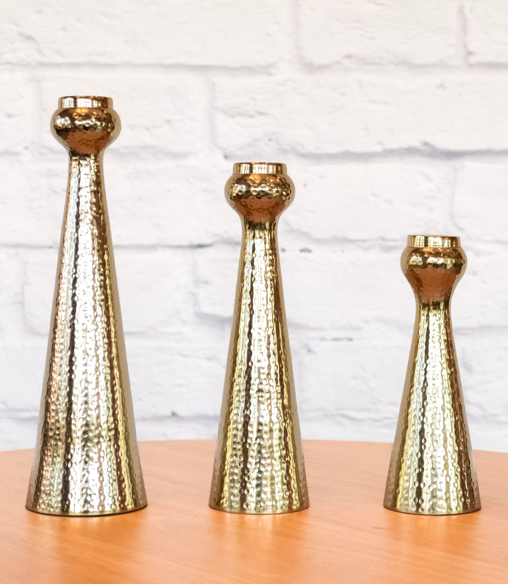 Elevate your tablescape with this stunning Hammered Taper Candle Holder, a piece that's equal parts elegant and fun! Available in gold or silver, choose from three sizes to match your space perfectly. The hand-hammered metal surface catches light beautifully, creating a mesmerizing glow that dances across your décor. Whether you're decking the halls for the holidays or adding year-round charm to your home, this timeless treasure brings texture and sophistication to any room. A playful nod to classic candlelit elegance!