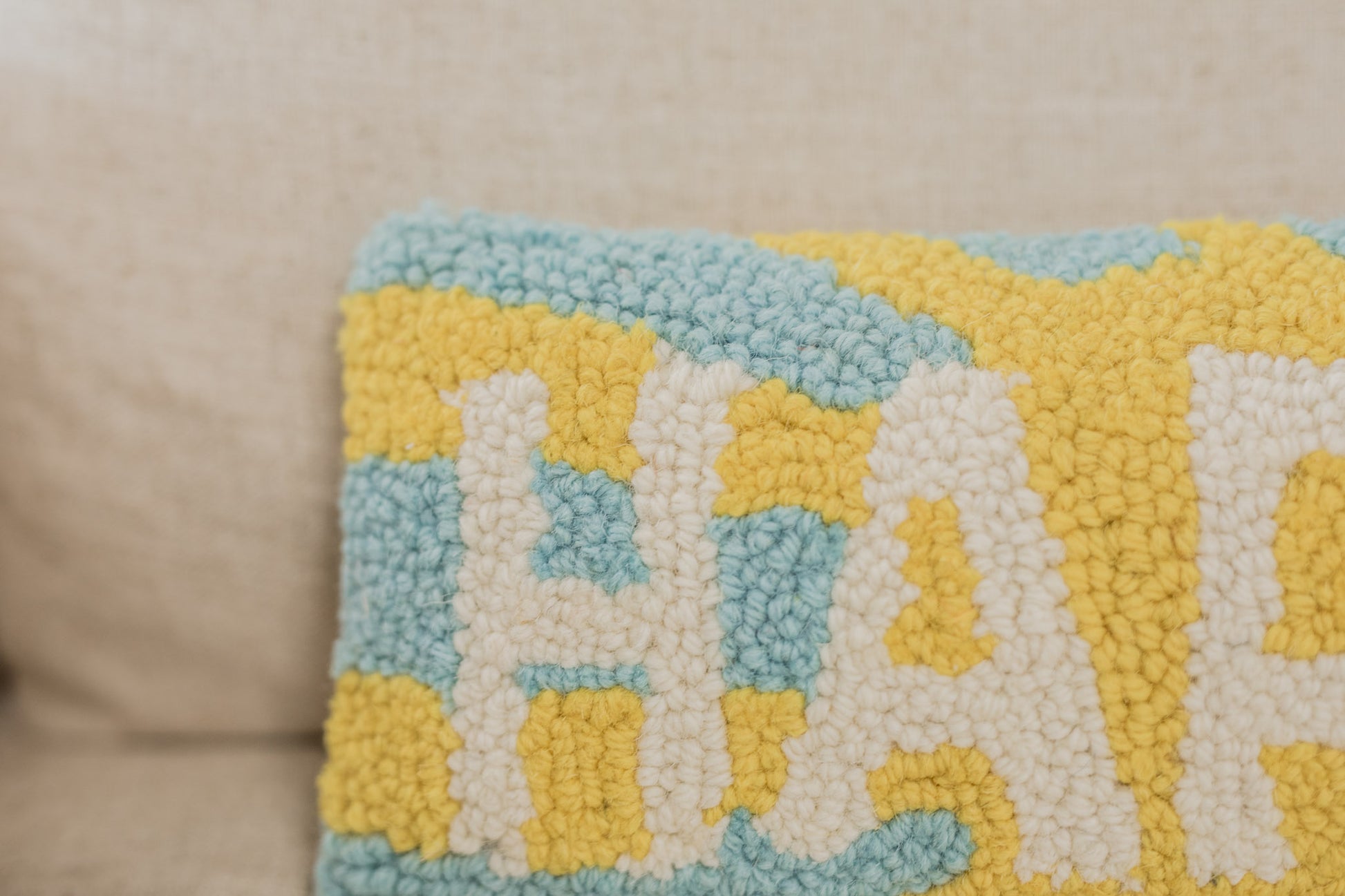 Bring a little sunshine into your room with this "Happy" Hook Pillow! Featuring bright cotton hook fabric, white lettering, a sky-blue background, and a shining sun, this charming pillow will add a touch of fun to any space!