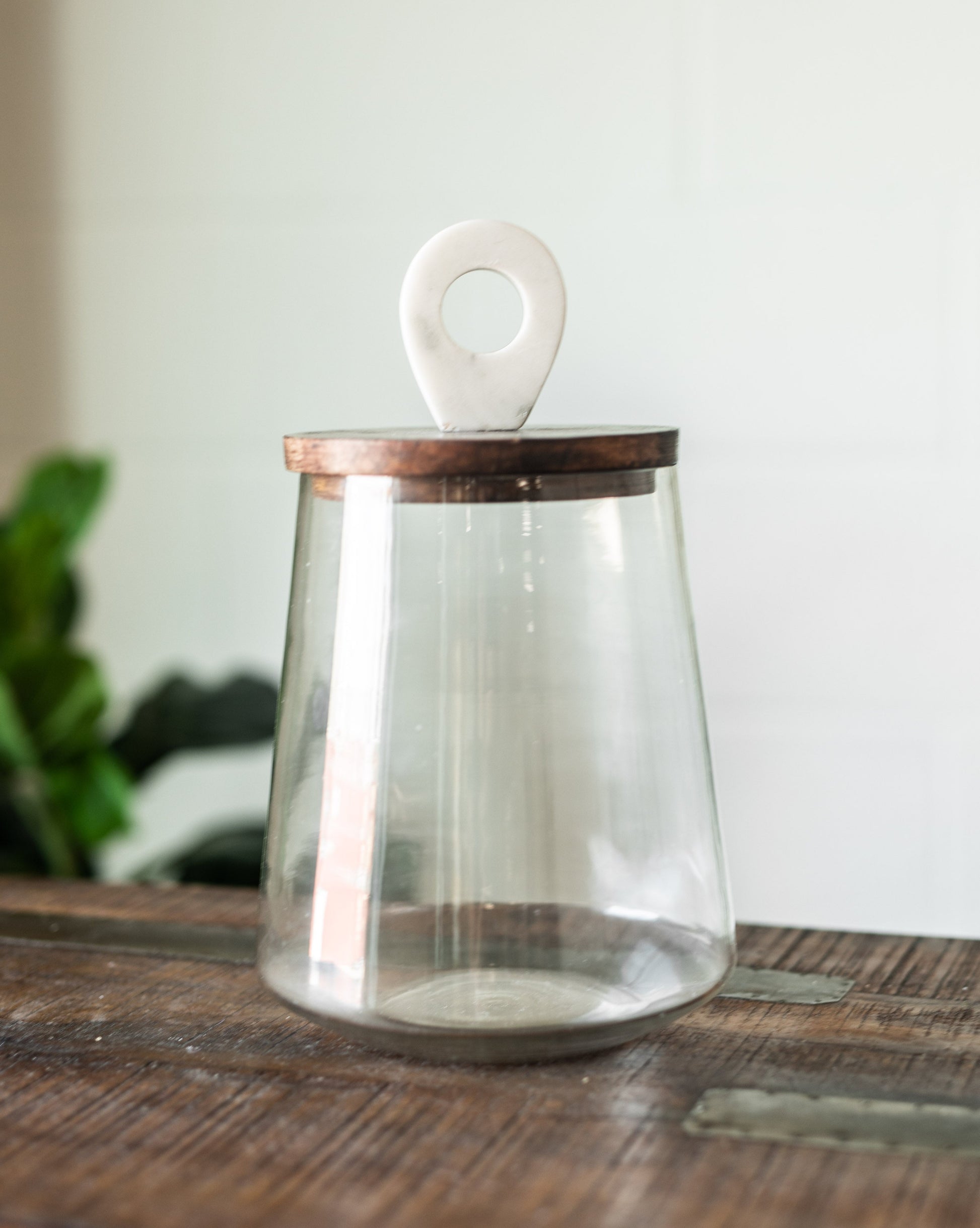 This gorgeous glass jar has a mango wood lid and a marble handle, making it perfect as a display piece in your bedroom, or to store cosmetics in your bathroom!