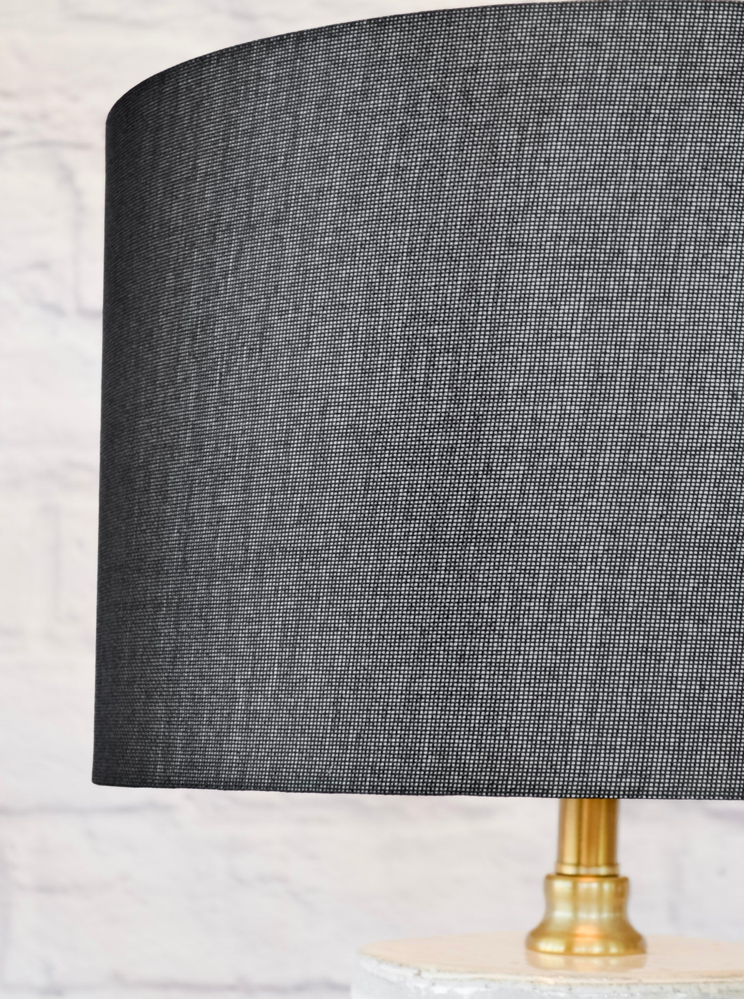 The Kiki Table Lamp blends modern sophistication with boho charm, featuring a ceramic cylinder base in black and white adorned with a unique repeating geometric pattern. Its gold-finished neck adds a touch of elegance, perfectly complemented by a black linen drum shade that diffuses light. This lamp brings stylish, tribal-inspired warmth to any living space!