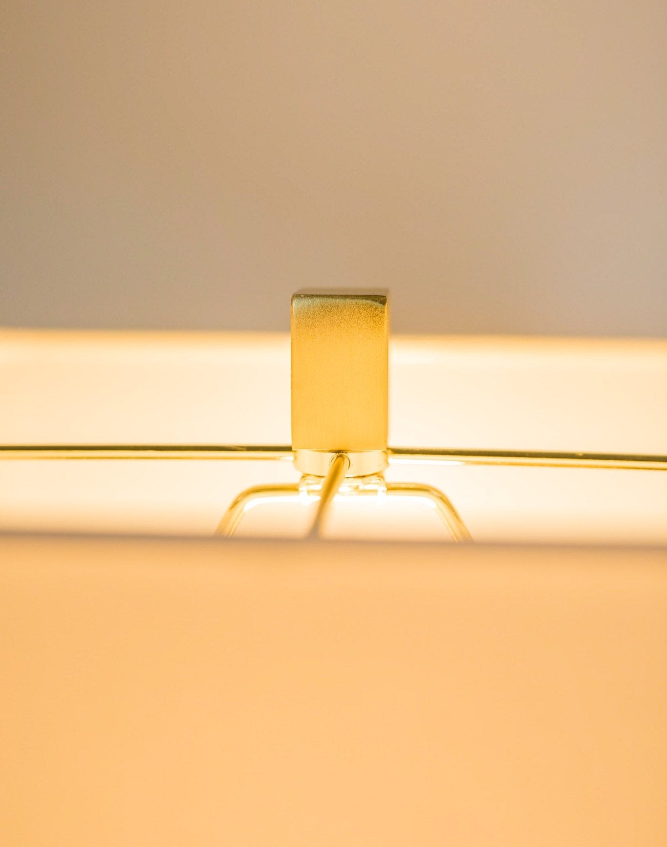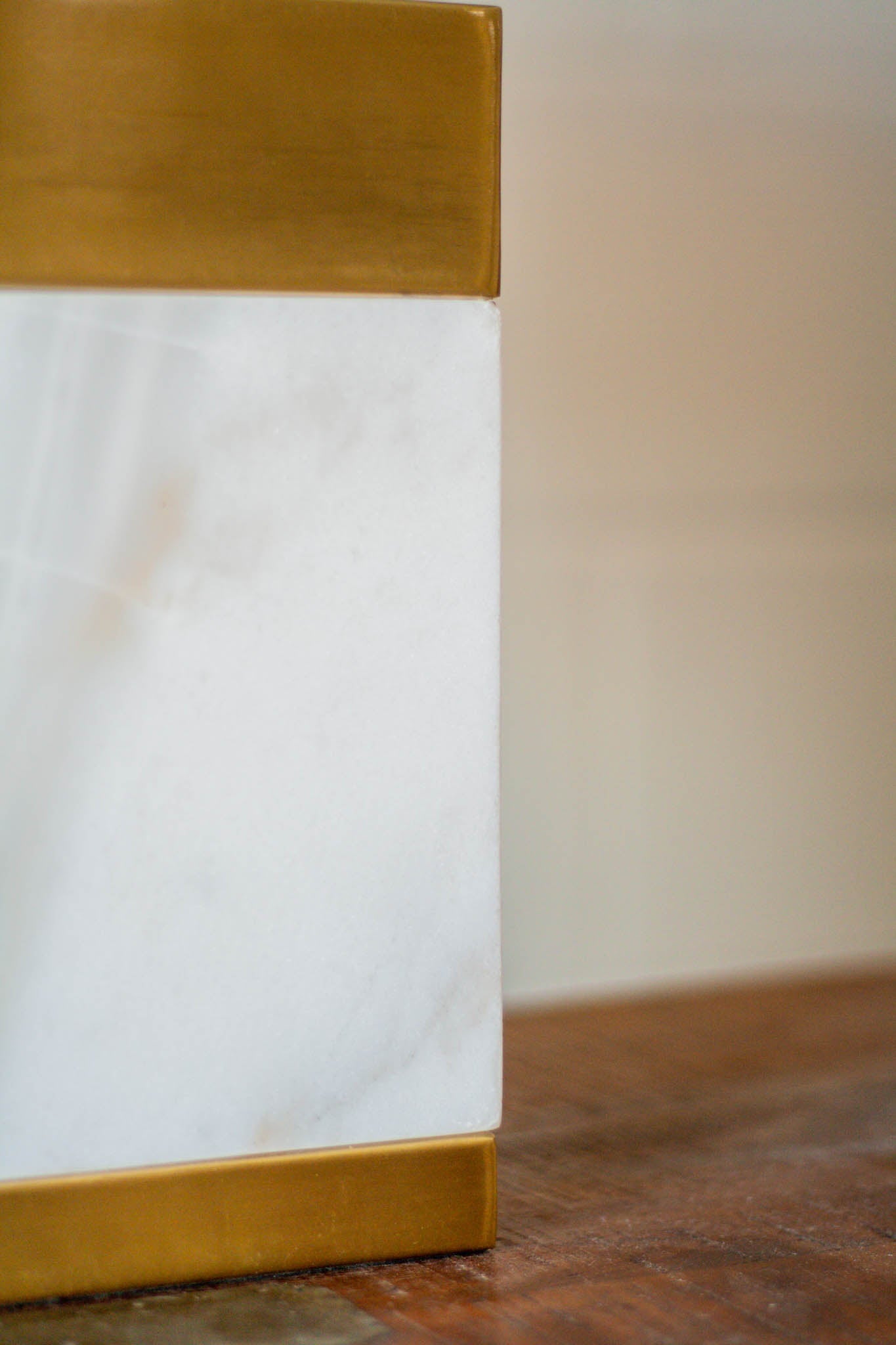 With a natural veining in the solid marble base and gold metal detail along the top & bottom, this lamp is beautifully designed. Finished off with a tall white rectangular linen shade, a lovely addition home office, den or study.