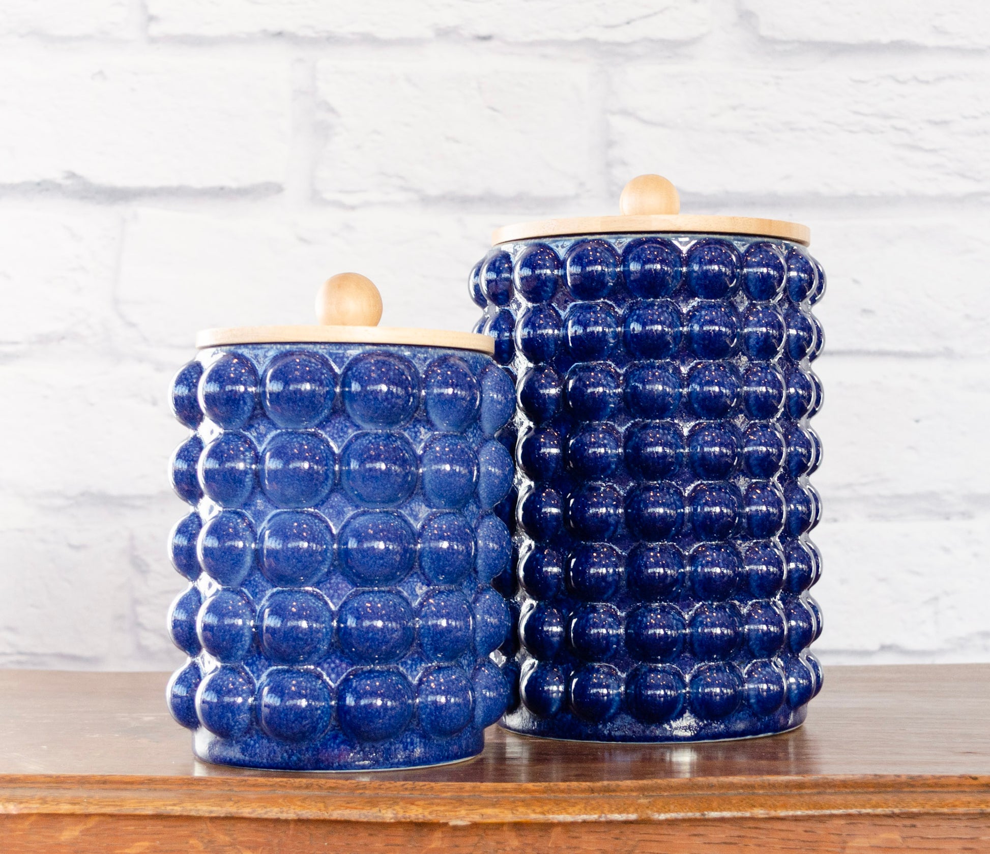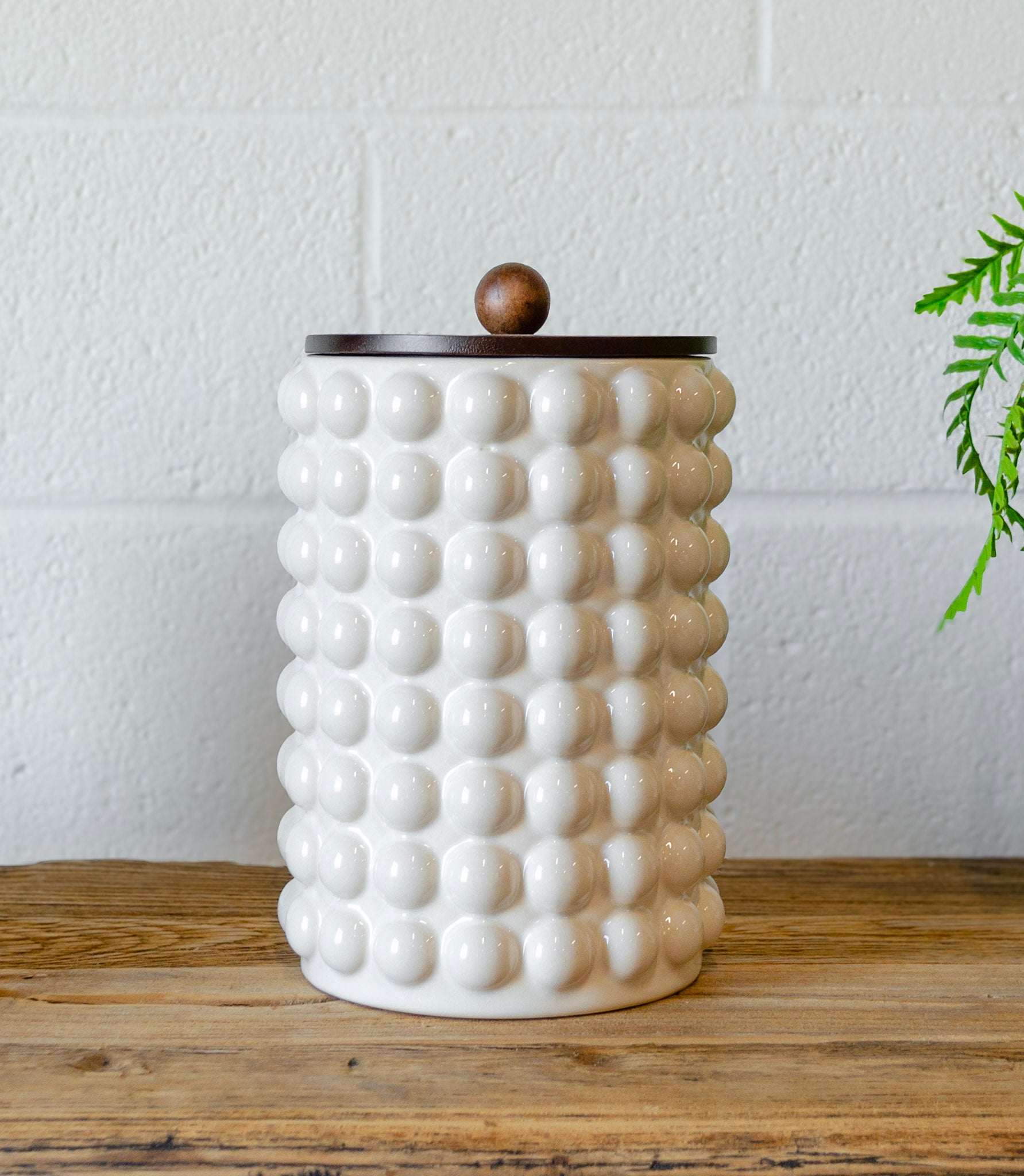 Add a charming touch to your kitchen or bathroom with this lidded stoneware jar! With an adorable hobnail pattern and natural acacia wood lid, it comes in 3 sizes and 2 colors to fit all your needs. Fun and versatile!