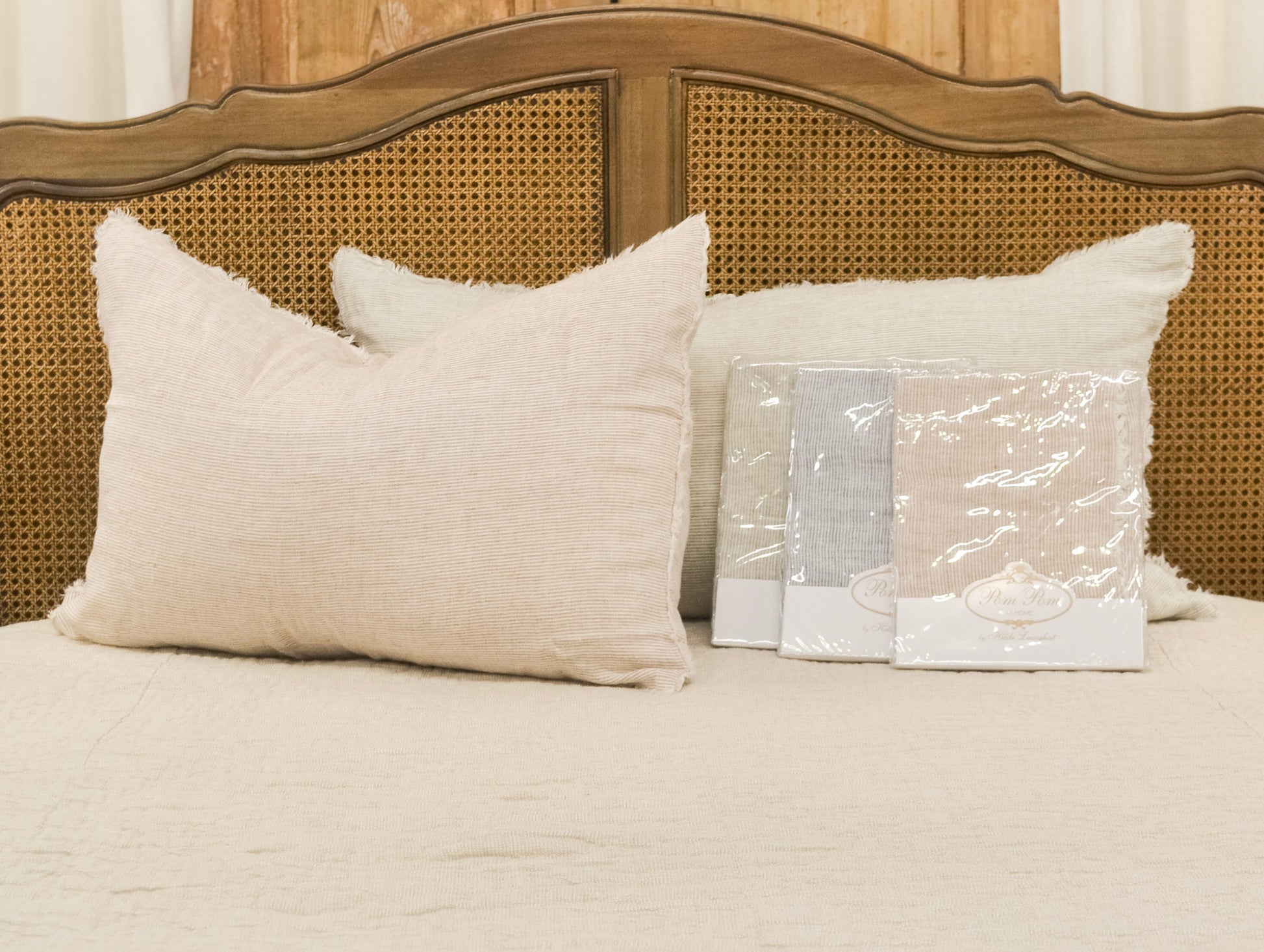 Subtle frayed edges of soft linen add a dash of unexpected detail to this Logan Collection. Woven with two different colored yarns for a heathered effect, the duvet cover and shams feature shell button closures!