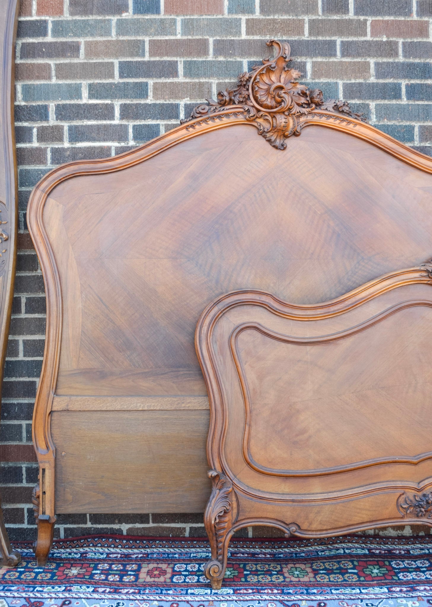 Louis XV Style Well Carved Flourish Crowned Bed. In walnut with wooden rails.