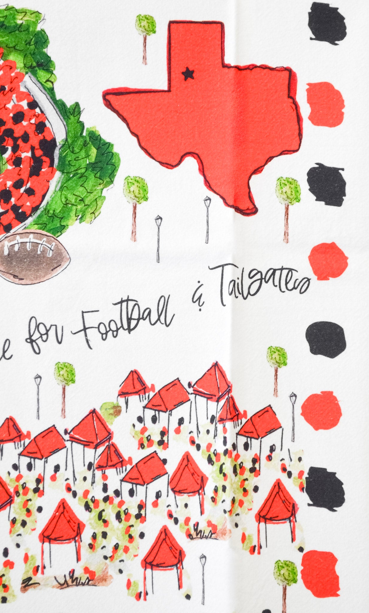 Celebrate Lubbock pride with these charming tea towels, featuring playful script and football motifs scattered across a crisp white background! Perfect for game day gatherings, watch parties, or everyday kitchen use, they're a spirited way to show your Texas Tech love. Whether you're cheering from home or hosting friends, these versatile towels bring fun and flair to any occasion. An ideal gift for the Red Raider in your life who bleeds scarlet and black!