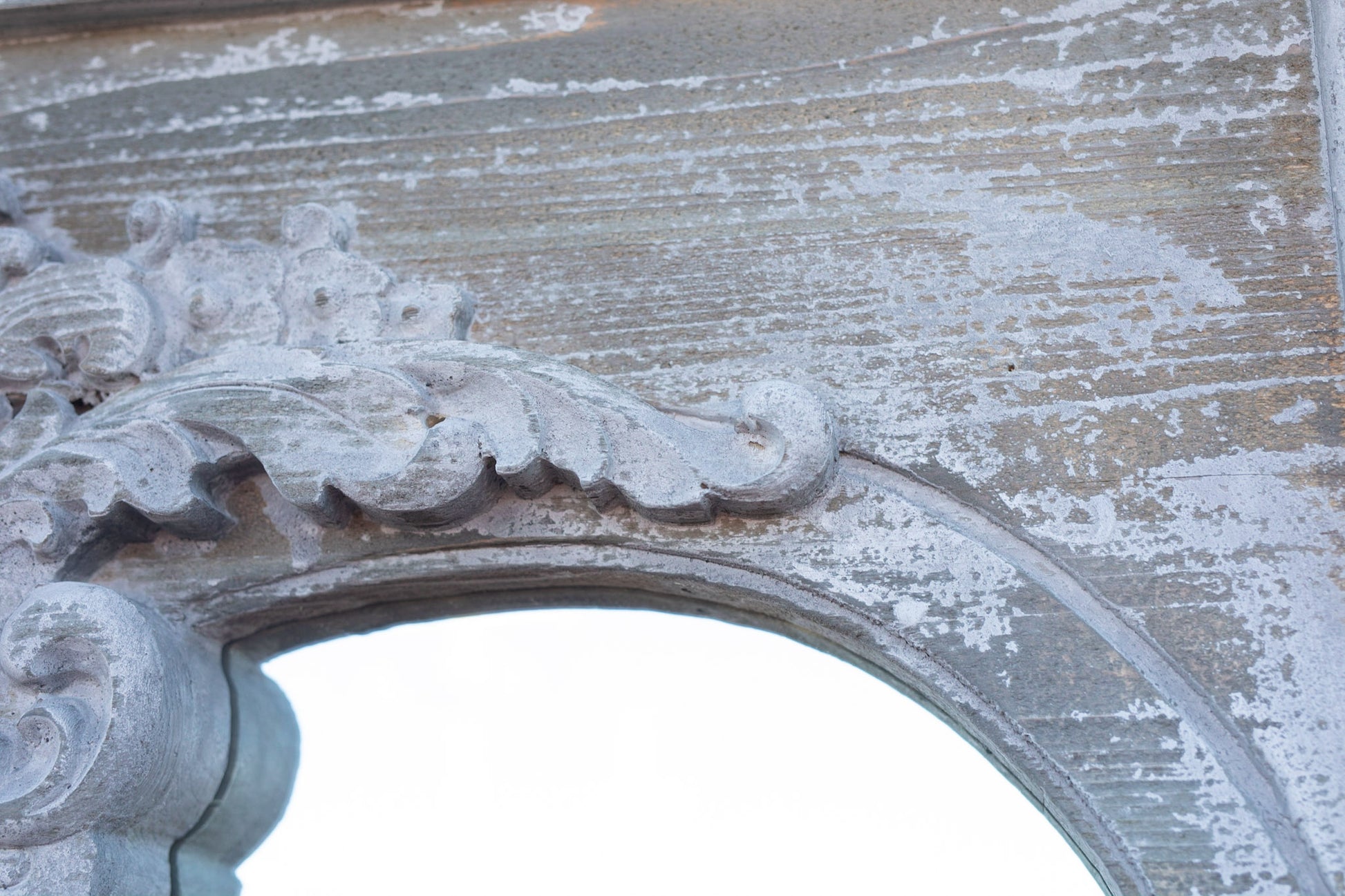 Impressively scaled, this dazzling mirror is large enough to lean against your wall, but can really light up a room when set upon a sideboard or mantle. The soft natural pine and gray finish is highlighted by elaborate floral carvings and classical molding details!