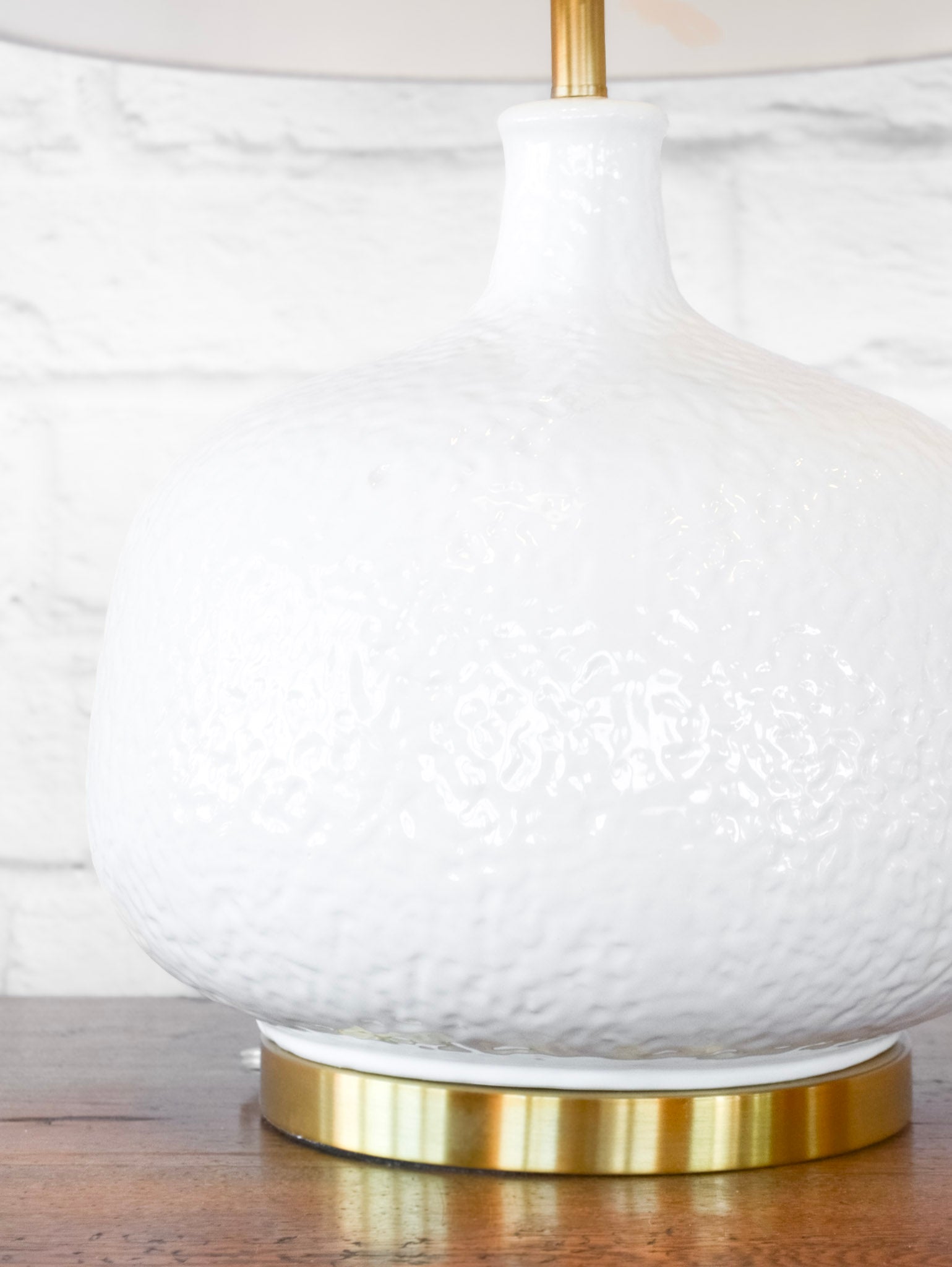 Bring some shine to your space with the Melody Lamp! This gold and white table lamp features a textured ceramic and metal body shaped like a chic gourd. Its glossy finish flaunts subtle grooves that add a unique twist to its modern vibe. Topped with a crisp white drum shade, it casts a cozy, inviting glow perfect for any living room or bedroom looking for a stylish boost!
