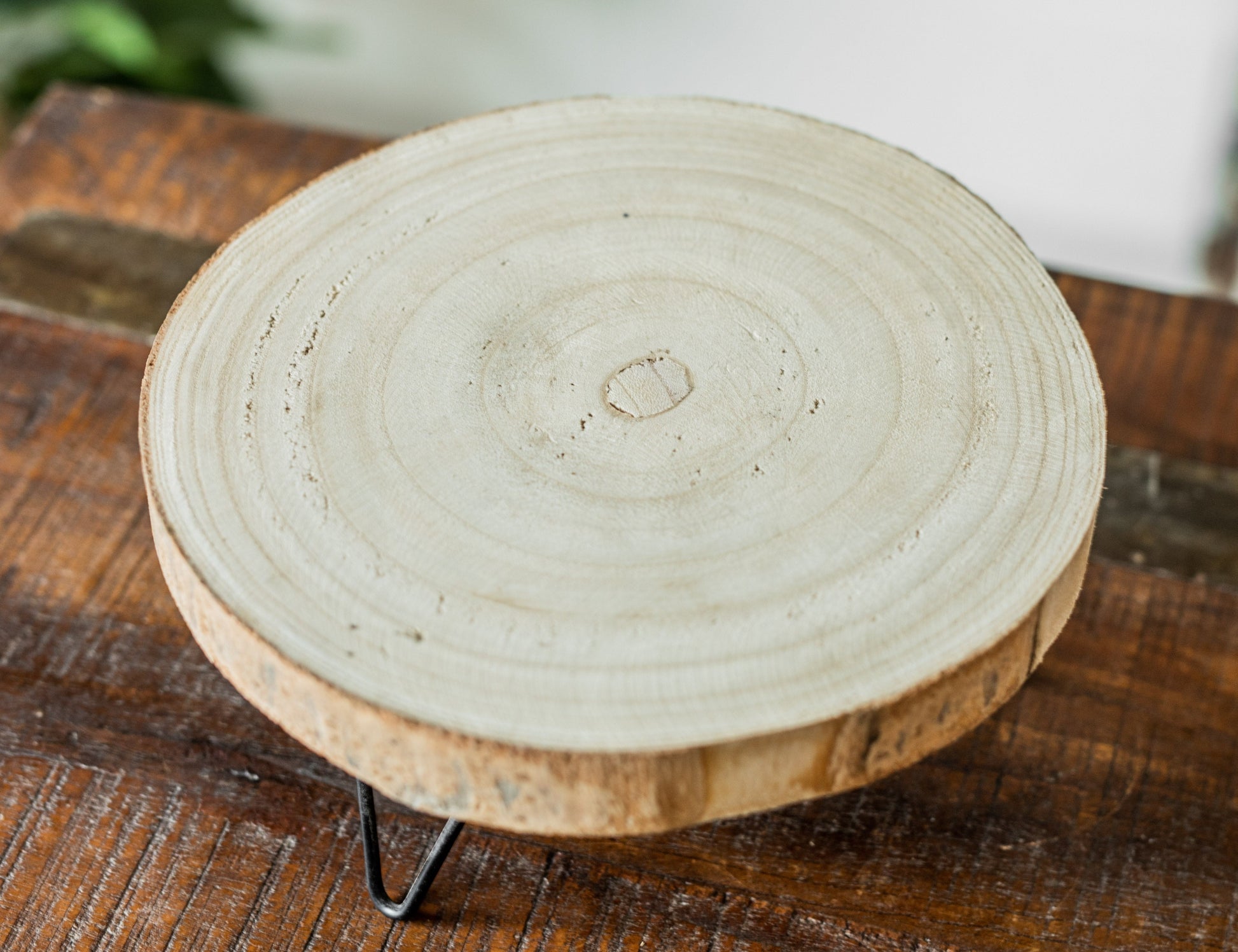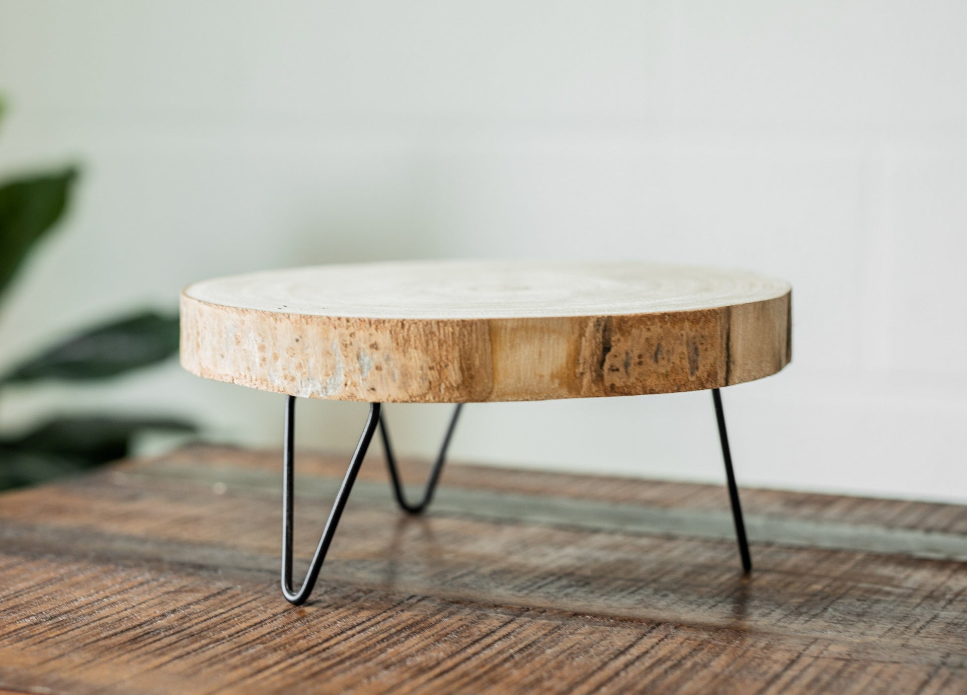 Add height and natural texture to your tables with this round riser! Features hairpin black metal legs to add a modern touch. Each varies slightly.