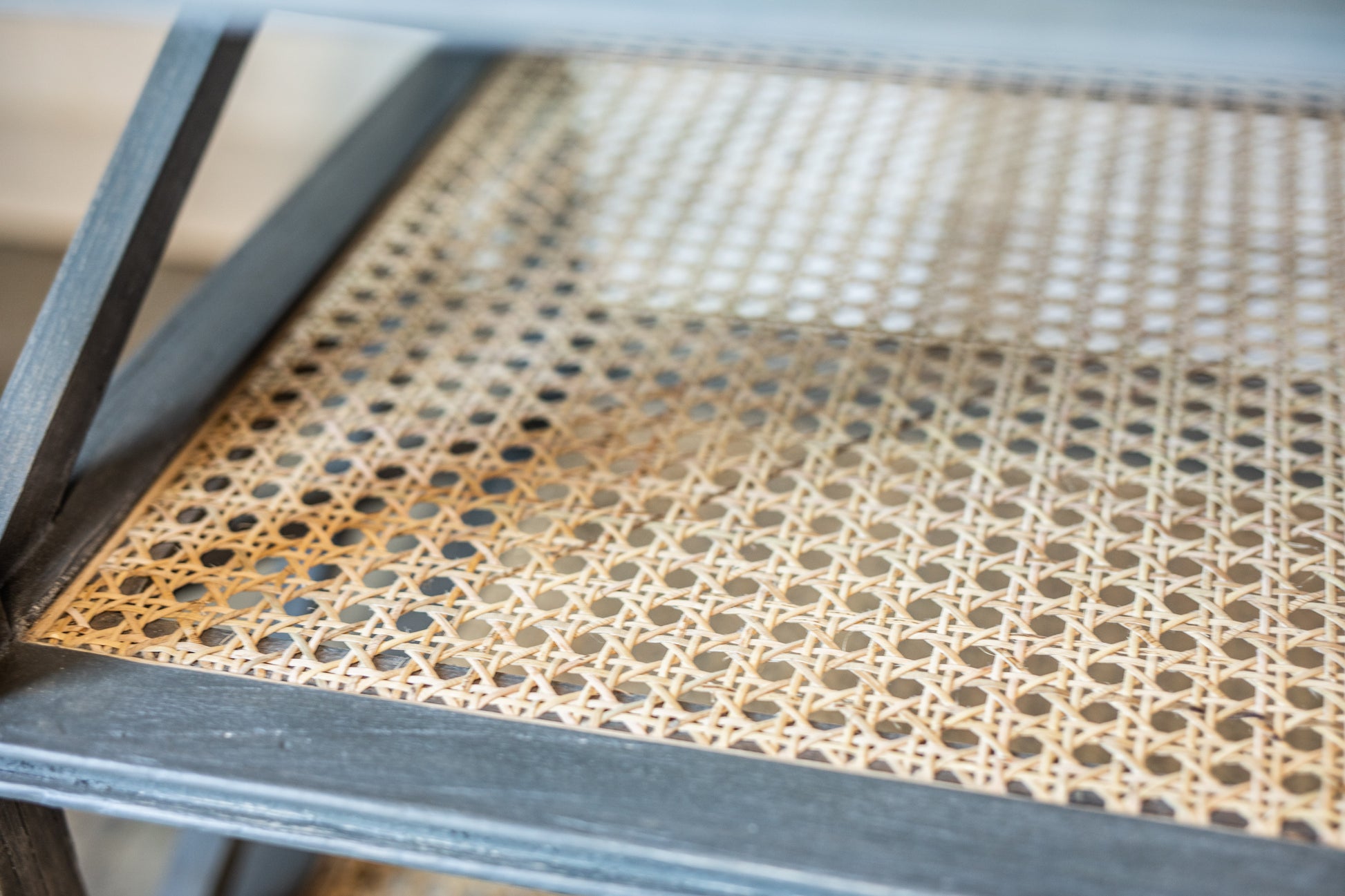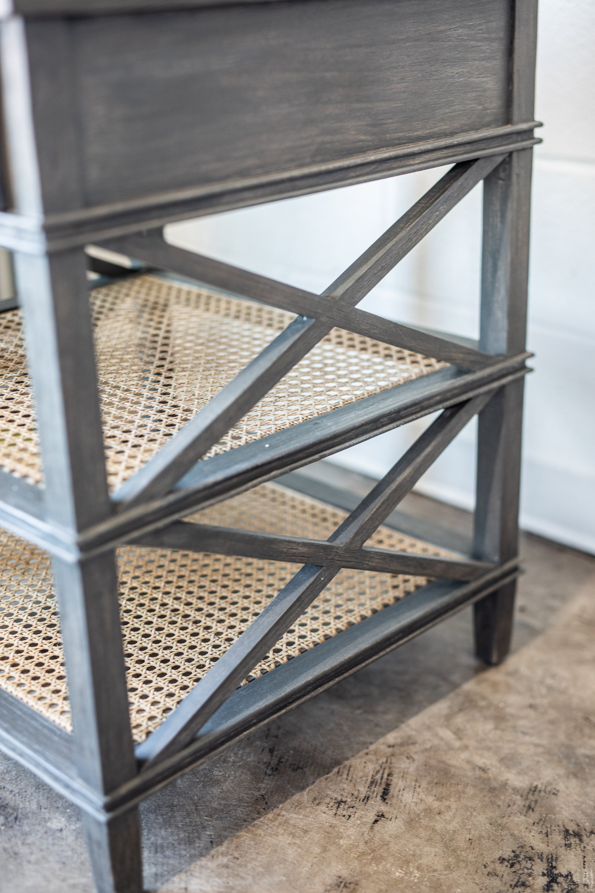 Timeless neo-classic design is reinterpreted with simplified sleek lines and a charcoal finish which contrasts beautifully with the natural rattan tones of the hand woven caning. The caned shelves provide ample storage for tablets and old school reading material, and the drawer is perfect for cables, remotes, and your reading glasses! Each sold separately.