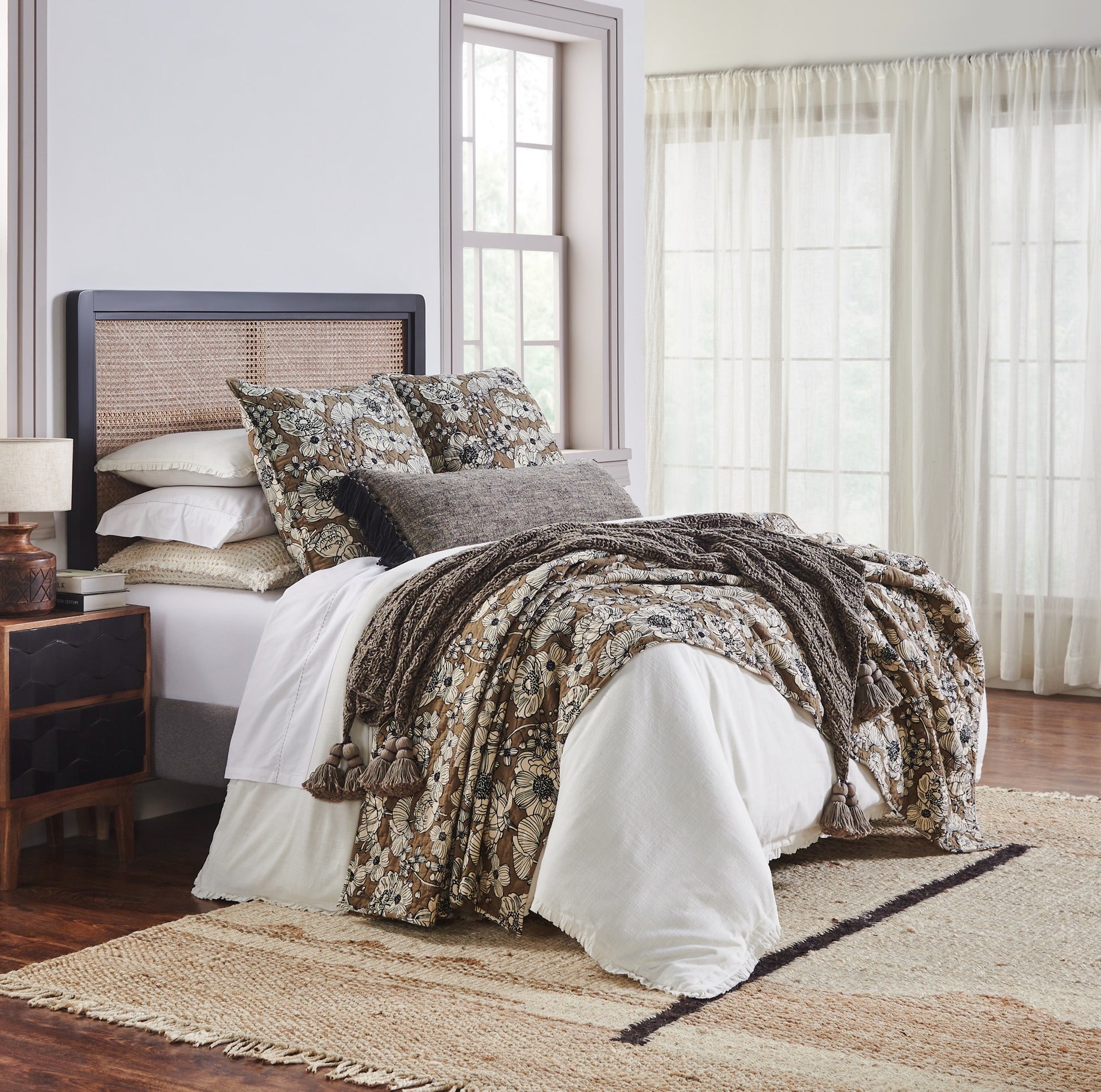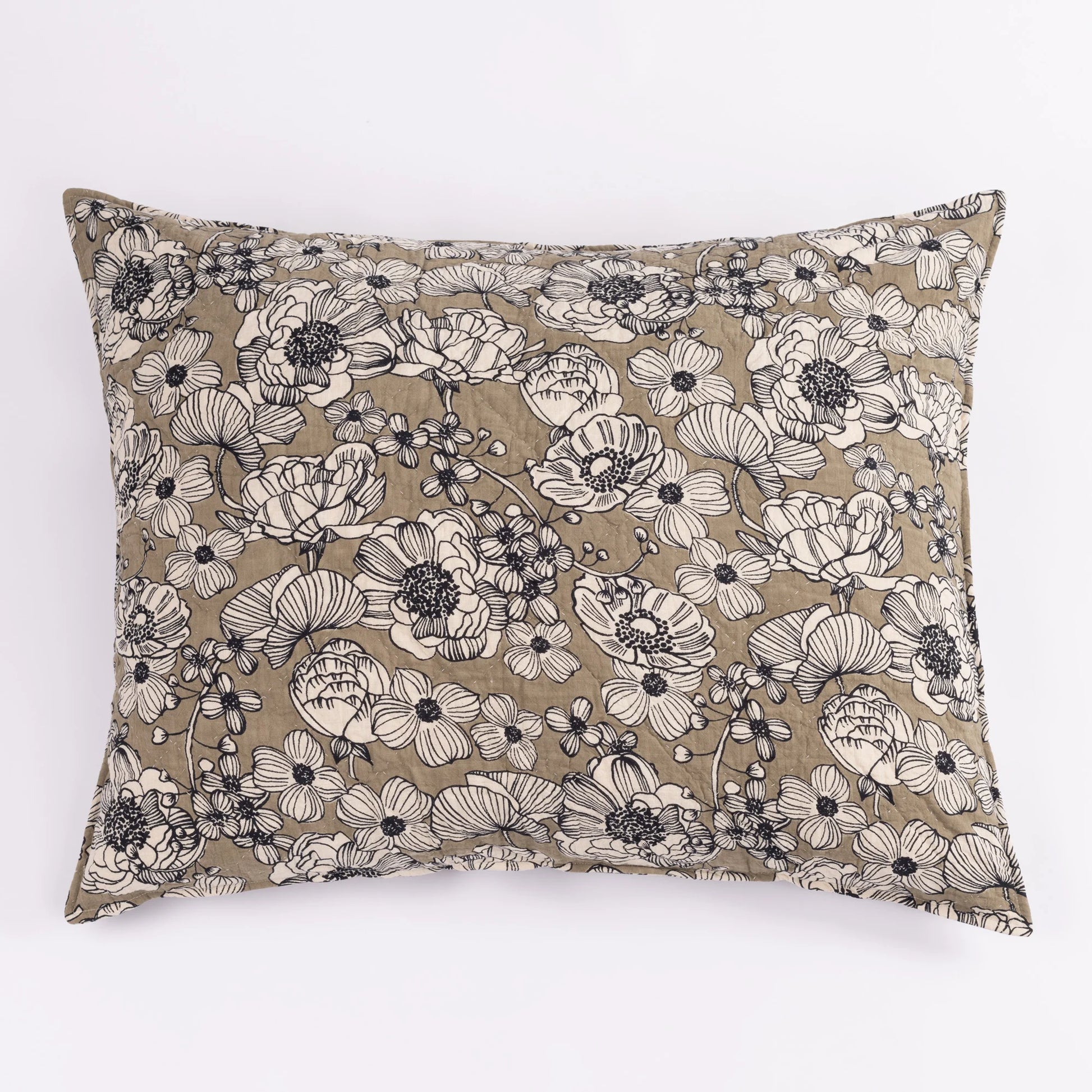The Tinsley Bedding Collection offers a charming contrast, featuring a floral design in black outline on a soft cotton base, set against a gorgeous green background. Crafted from 100% cotton and hand quilted for a cozy feel, this collection brings together drama and effortless style, making it perfect for both center stage and complementary accents!