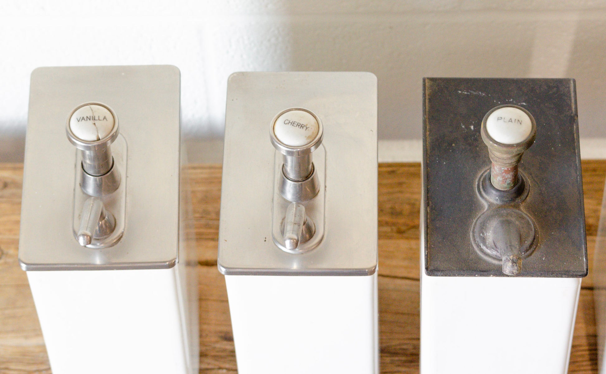 Vintage soda shop syrup flavoring pumps. Ceramic base, metal top.